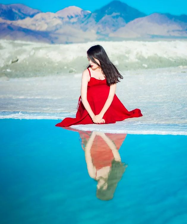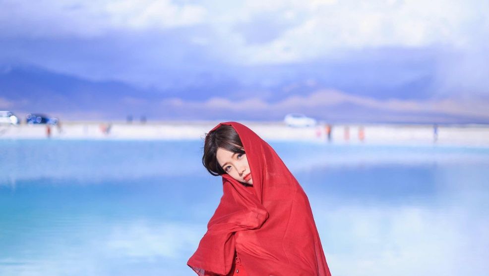 和茶卡一样,翡翠湖和红衣红裙是最相配的。