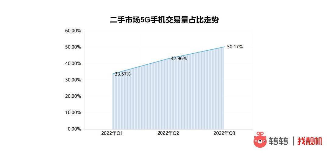 热门机型中,小米和华为势均力敌。Q3转转集团手机行情显示,二手国产手机交易量Top10机型榜单中,小米和华为分别上榜4款手机。 5G占比“过半”,iPhone 6“钉子户”结束换机周期 三季度的5G手机市场,持续增长。 此前的季度行情报告中,转转数据部分析师预测今年下半年二手市场5G手机的交易占比有望“过半”;最新发布的Q3转转集团手机行情则显示,今年三季度二手市场中5G手机的交易量猛涨,占比已达到50.1%,环比增长7.21%,同比增长26.87%。
